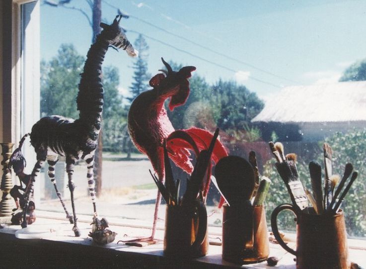 Even in his 90s, with failing eyesight and limited mobility, Floyd continued to turn out a steady supply of imaginative, fantastic sculptures. These figures, made in wire and yarn, range from mythology to the edges of reality or depths of his own imagination. Friends brought him scraps of yarn, old coat-hangers, and miscellaneous “found” objects that got incorporated into dozens of new sculptures.