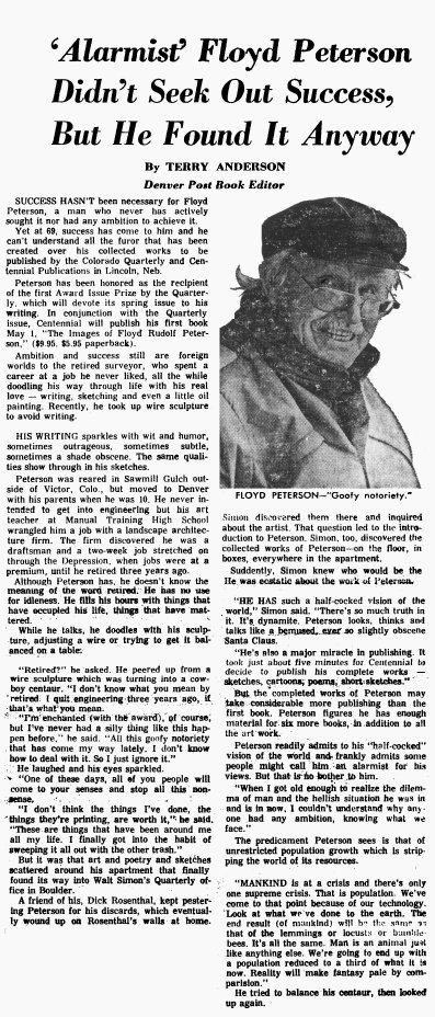 In 1977, samples of Floyd’s poems, short pieces, and bizarre drawings were published by the University of Colorado, Boulder, as a special edition of Colorado Quarterly (Volume XXVI, No. 1). The Images of Floyd Rudolf Peterson, a slim 124-page volume, was the First Annual $1000 Colorado Quarterly Award.