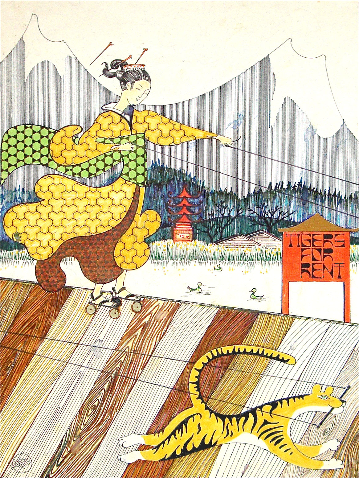 Looks like great fun! This is a particularly creative example of sports engaged in by Floyd’s elaborately clothed Asian ladies. Although only one participant and one tiger are shown, a second pair is evident, judging from the tow ropes.