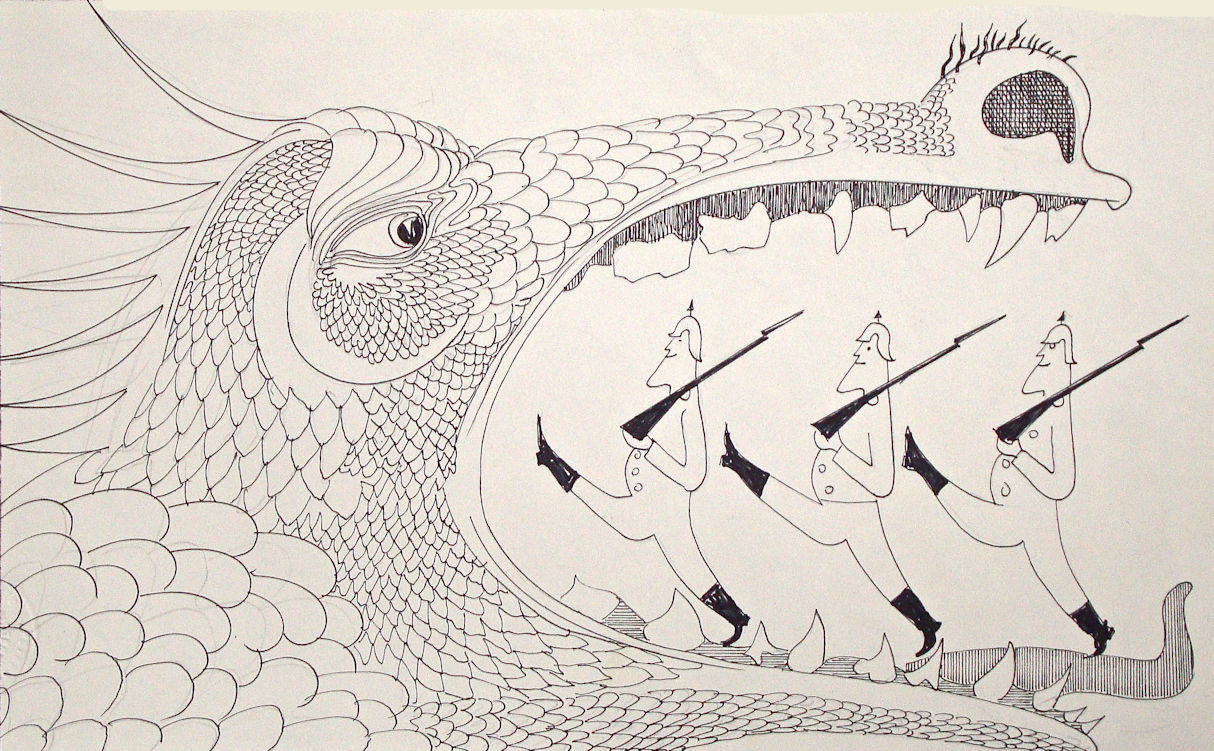 In this image of a woman on a flying carpet, the background is largely black-and-white, while the carpet and woman in the foreground show strong use of color. A cow is standing in the churchyard; the carpet has a horseshoe and a Hotei figure, or laughing Buddha. The drawing juxtaposes the ankh, Egyptian symbol of eternal life, with the Christian crosses on the church steeple and door.